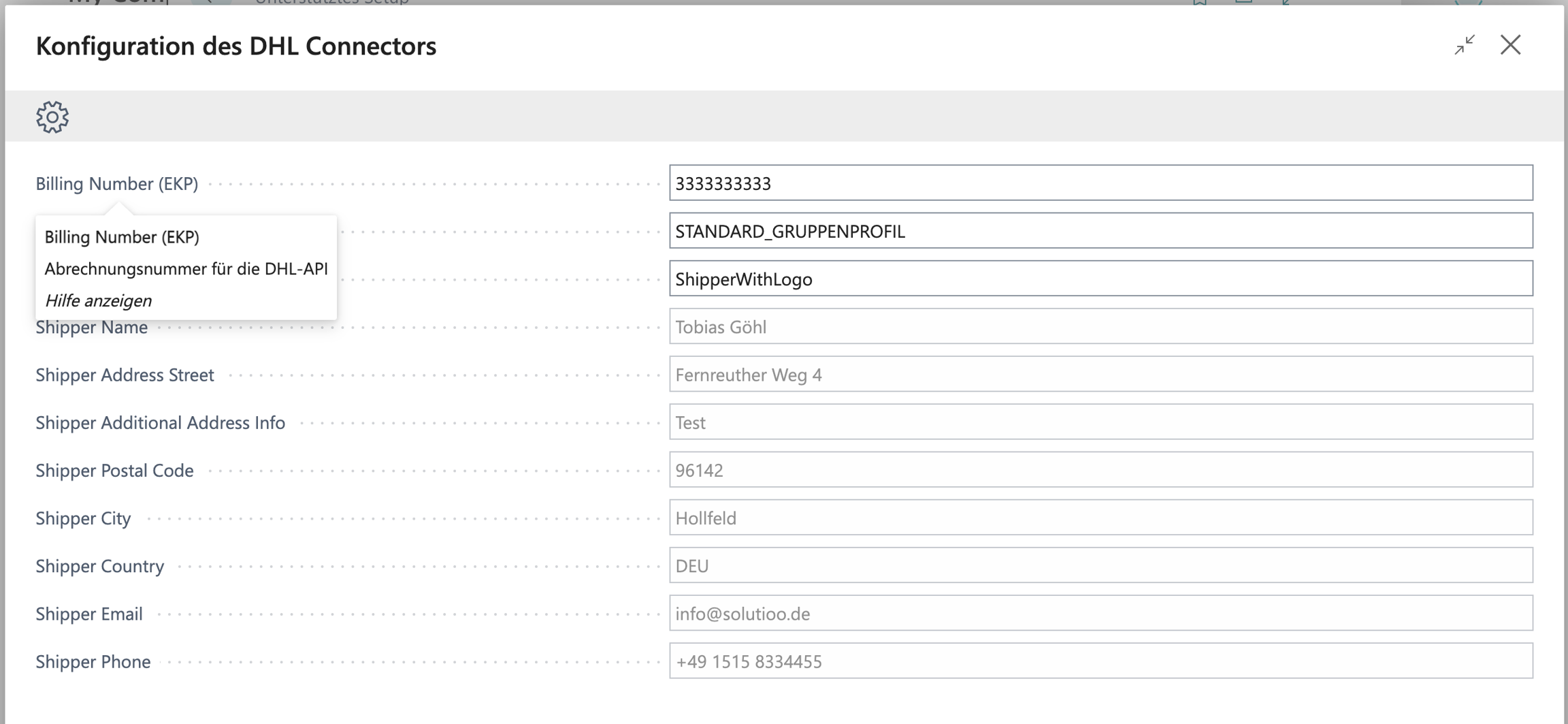 The Shipper Reference is used if you have defined a sender reference in your DHL Business Customer Portal and want to use that name as the shipper reference. If you specify this, the sender details below cannot be set within the connector and must be managed directly in the DHL portal. If you leave the shipper reference field empty, you must complete the following sender fields manually. You can find your shipper reference under Parcels & Goods > Templates > Shipment Creation in your DHL Business Customer Portal. Make sure to enter the template name exactly as it appears there.