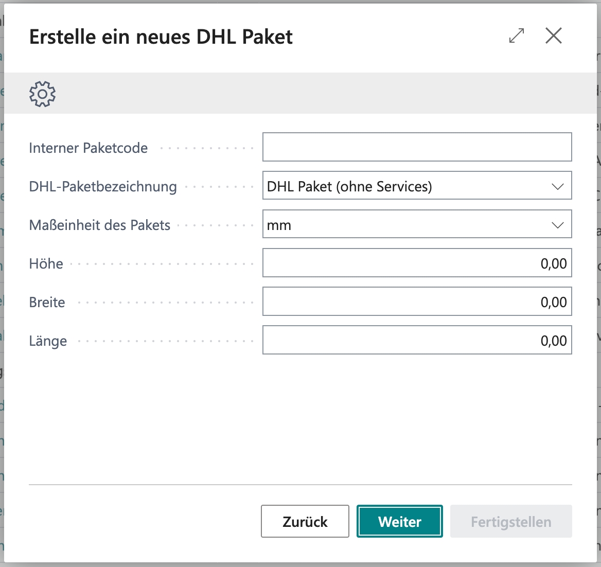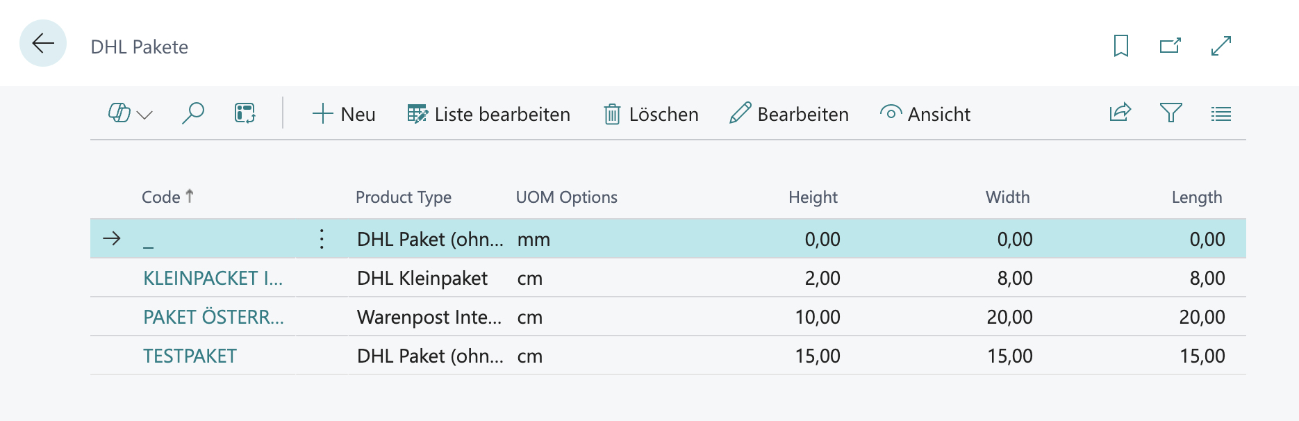 In this setup, you define the packaging types available for shipment. You specify their dimensions and assign the corresponding DHL parcel or packet type.